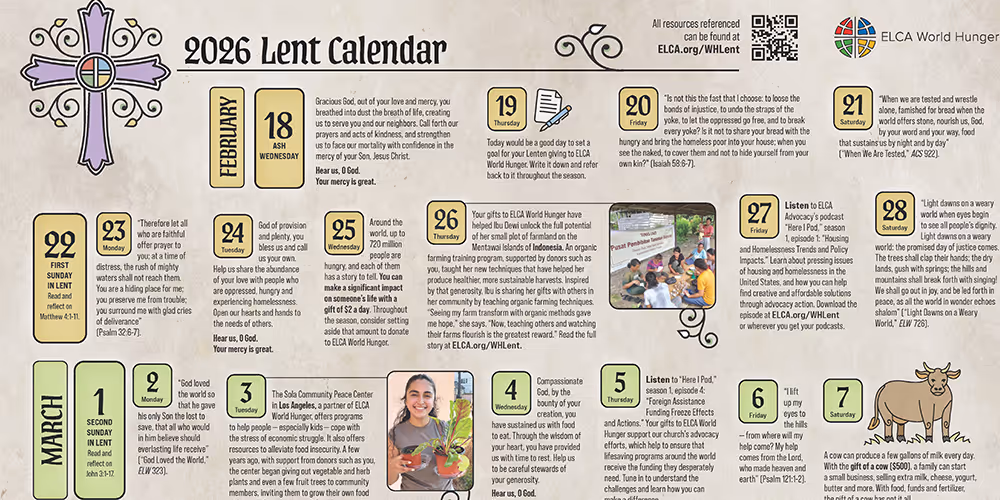 The ELCA World Hunger Lent calendar is available to enrich the life of your congregation during Lent. The calendar invites you to pray, reflect and learn about ELCA World Hunger’s ministry throughout the 40 days of Lent.